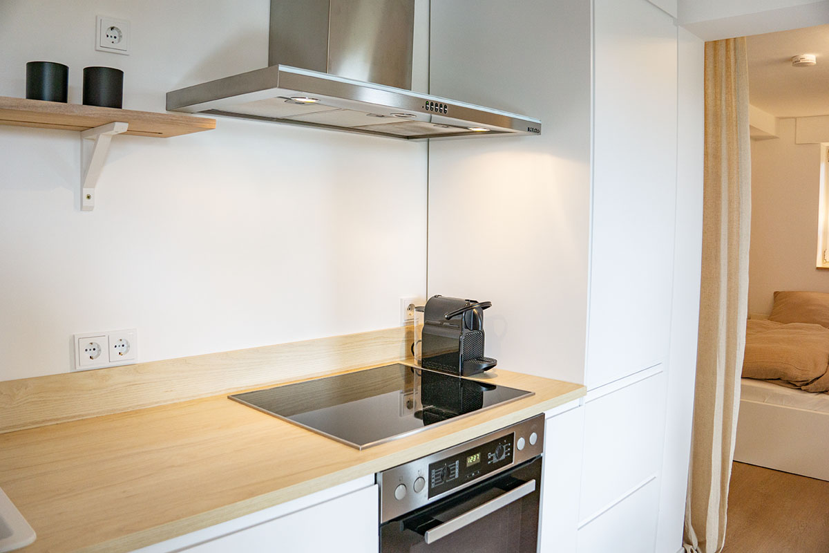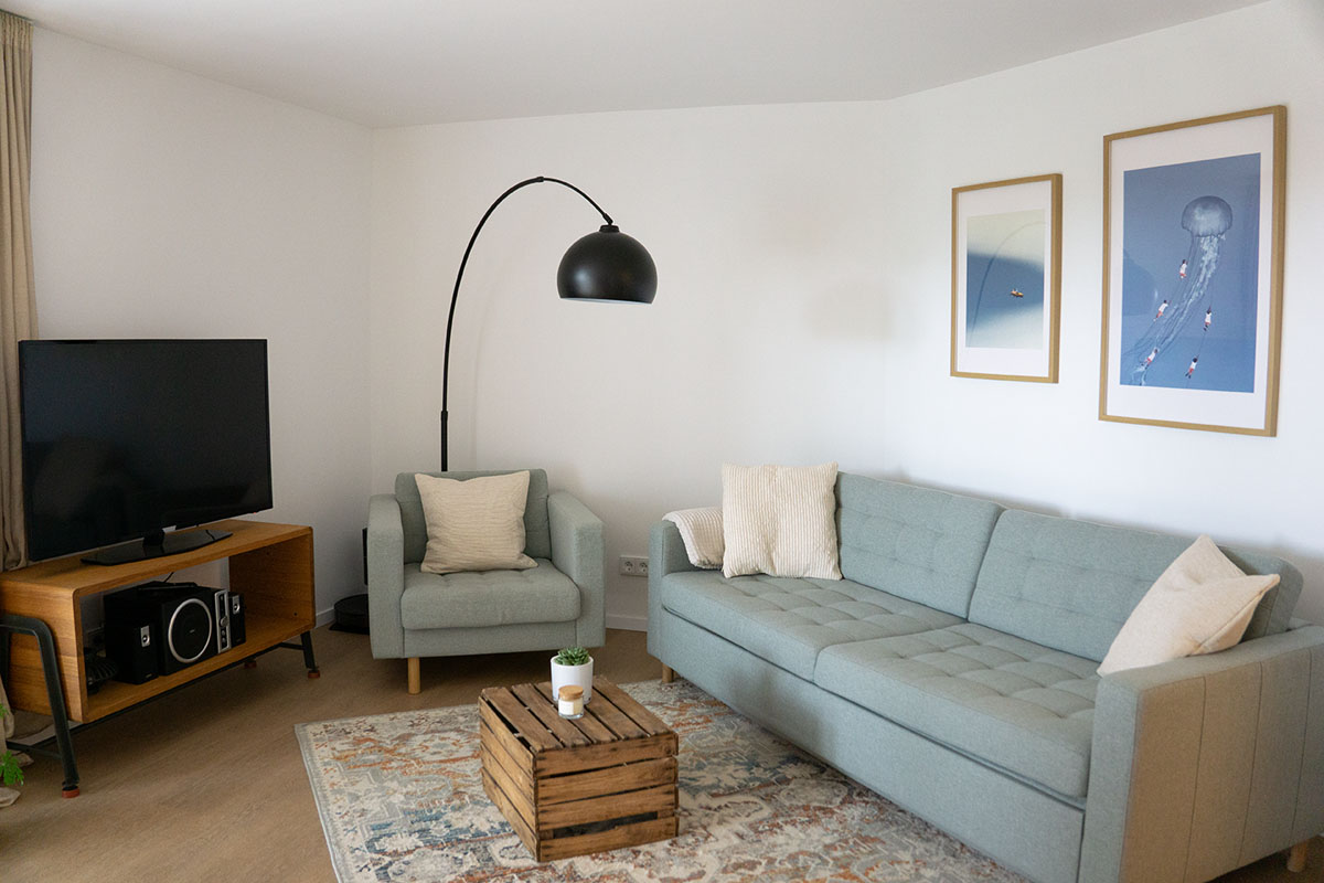 Die voll ausgestattete Küche inklusive Spülmaschine, das gemütliche Wohnzimmer mit großem TV und das ruhige Schlafzimmer sorgen für maximalen Komfort während Deines Aufenthalts.